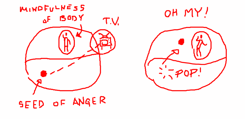 If it isn’t obvious from what’s above, mindfulness is not just awareness. It also has the function of recollection, a kind of contextualization of the object of awareness. It recollects “what is going on.” In the example with anger, what is going on? Did something on TV piss you off? Or are you dealing with a mind that has been conditioned to produce anger? The way you answer this question determines your future in the sense that it will shape which seeds get resown in store consciousness. There are two ways that things can go: